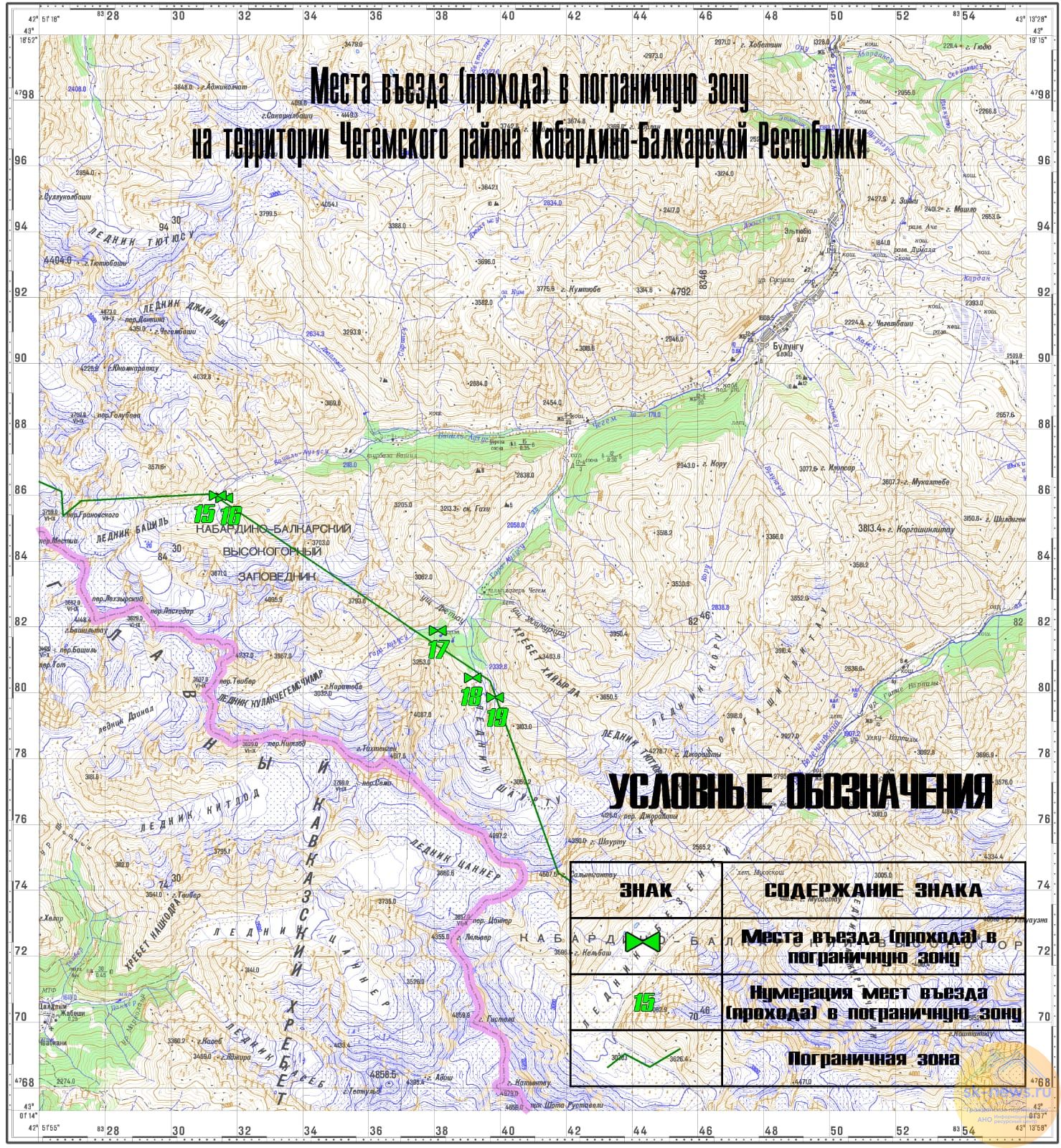 Также из пограничной зоны исключены альплагеря «Шхельда», «Джантуган», «Джайлык», «Уллу-Тау», «Башиль», «Чегем», «Безенги», пансионат «Приэльбрусье» и учебно-методический центр «Эльбрус», гостиницы и иные места размещения туристов, расположенные в верховьях рек Адыл-Су, Адыр-Су, Чегем, Черек Безегийский и Черек Балкарский.